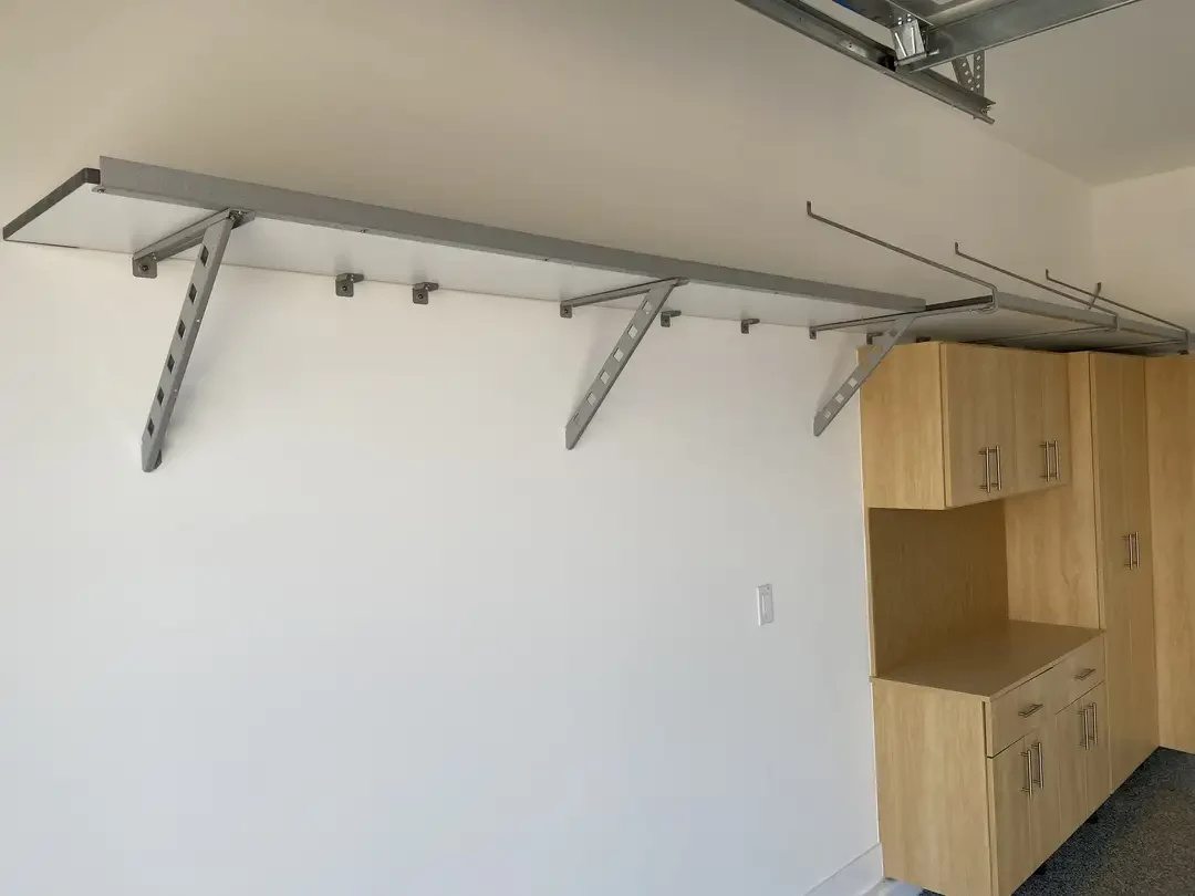 Once the cabinets ended, we transitioned from a 24″ deep inverted shelf to a 16″ standard Monkey Bar shelf, giving Derek the ability to hang items below and store gear above—even in the narrow space between the wall and the garage door track.