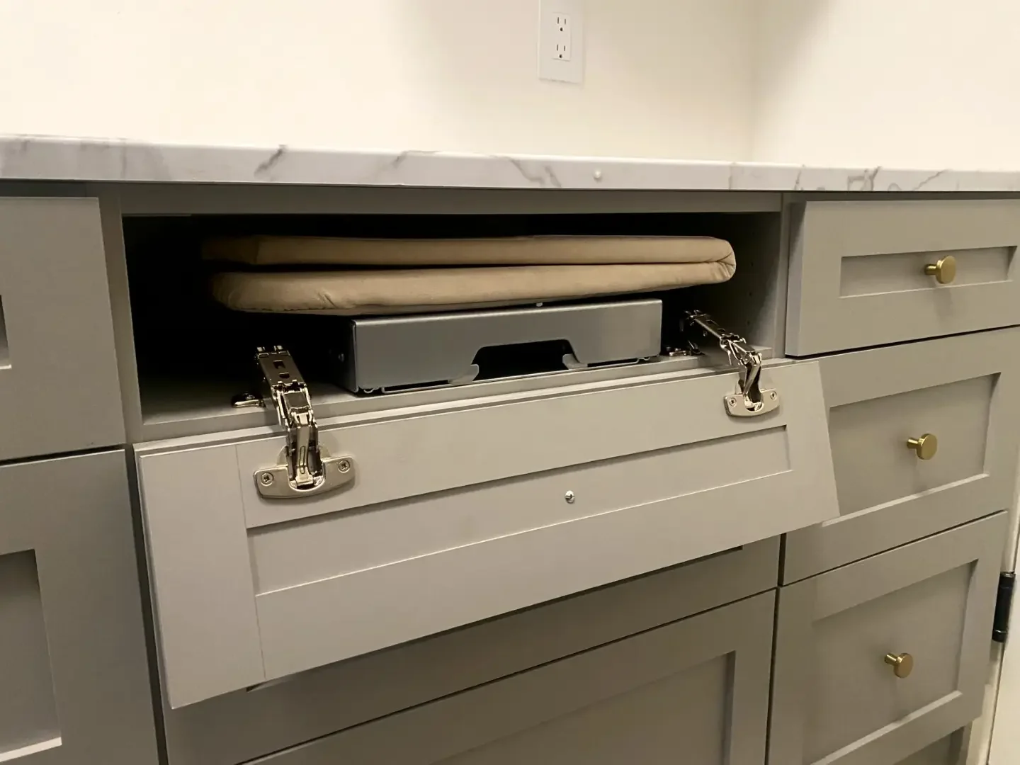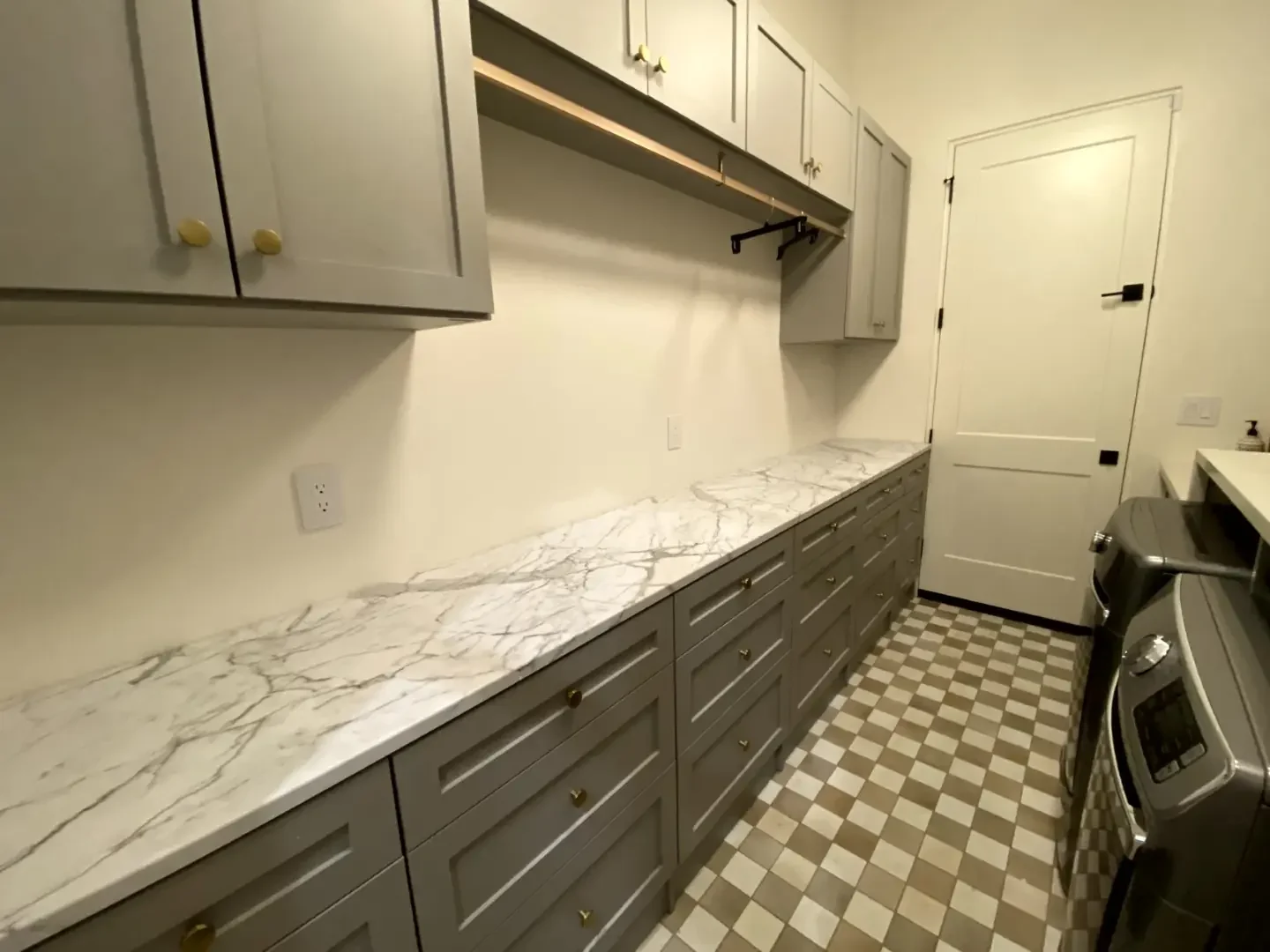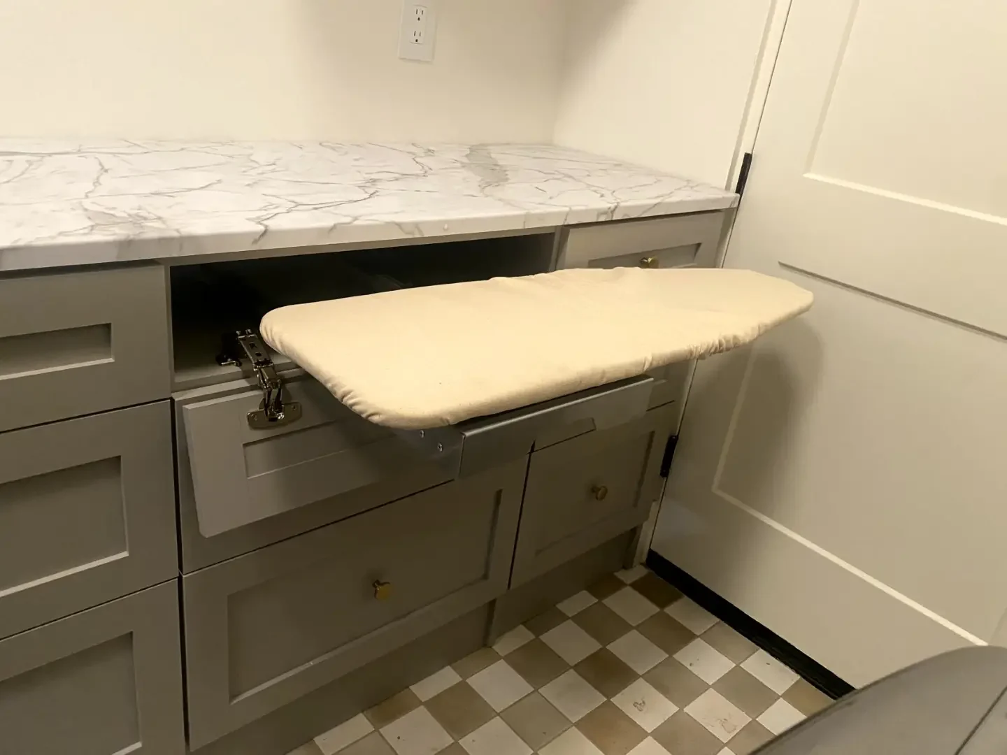 We installed an almost 12-foot long countertop with 18 drawers underneath (well, technically 17—because one of them hides a folding, rotating ironing board that slides out and tucks away like magic).