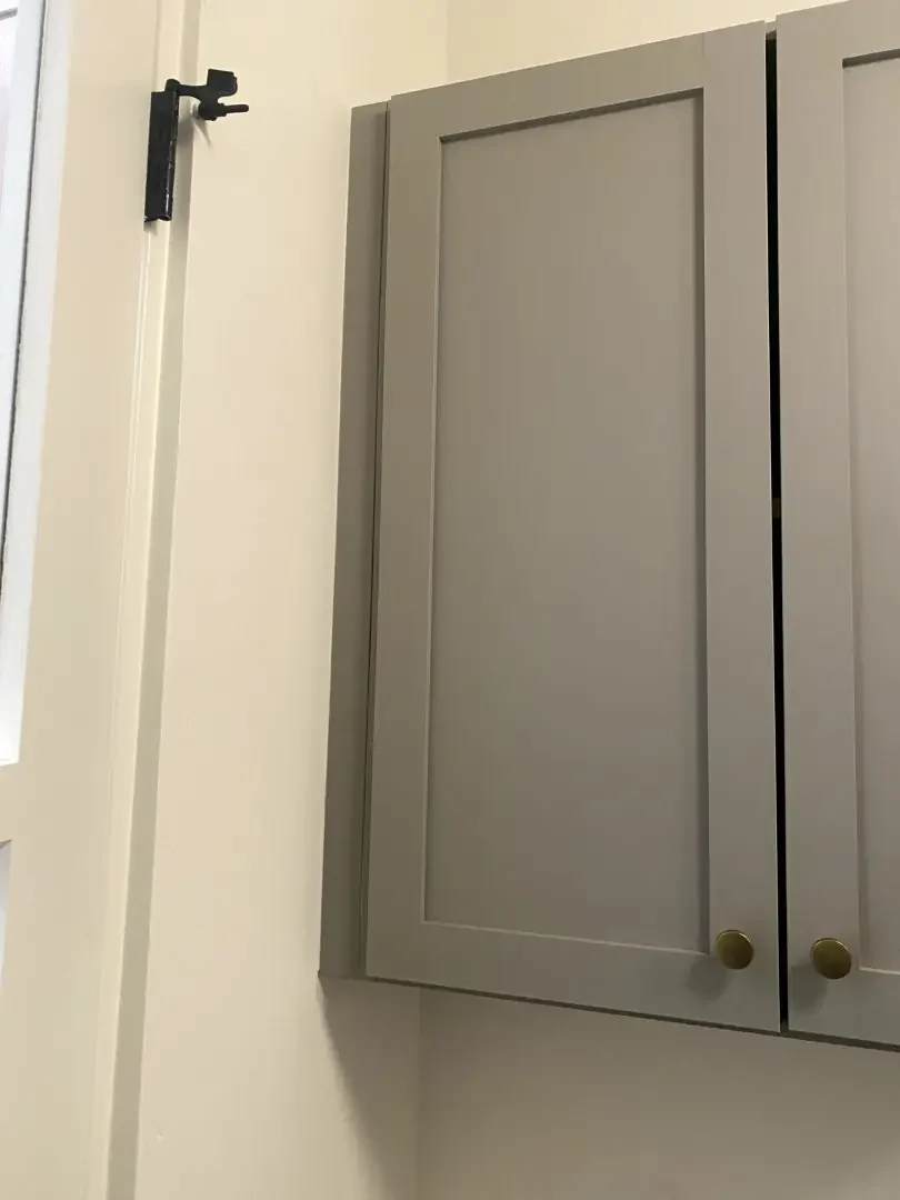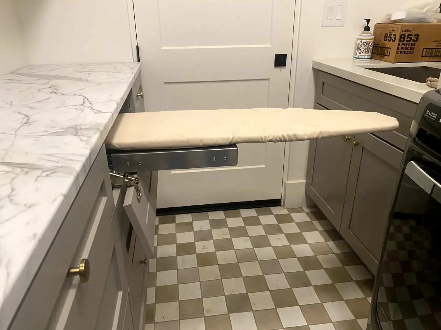 Above the counter, we added a clothes hanging rod so freshly ironed shirts could be hung immediately—no wrinkles, no wasted effort. Paired with additional upper cabinets, the space is now as beautiful as it is functional.