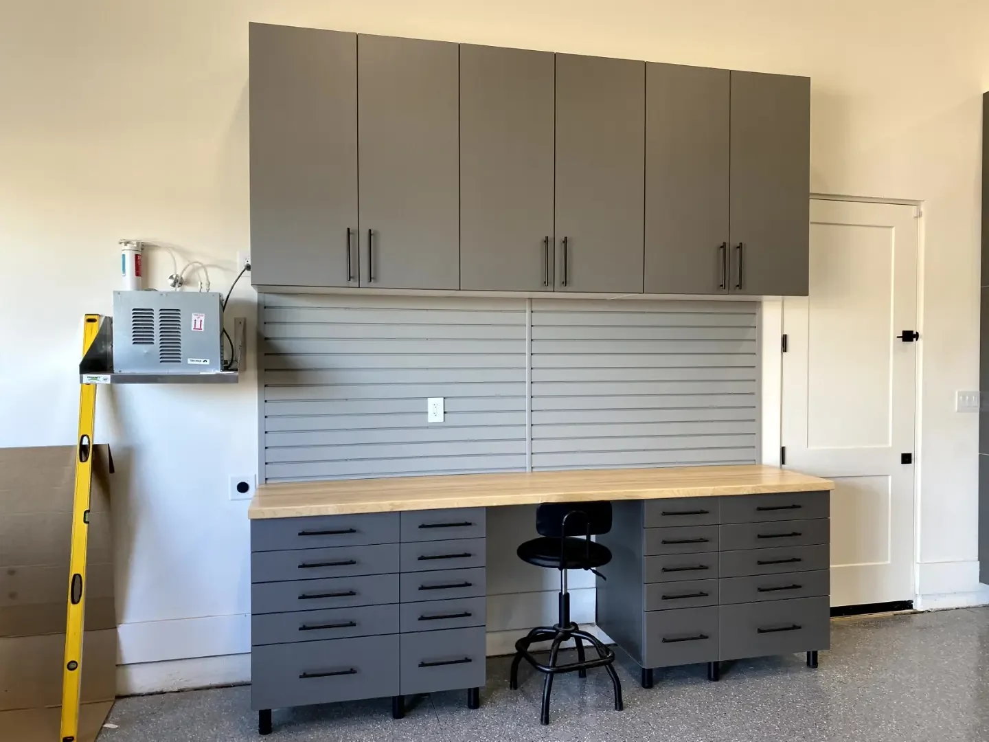 - A 3-foot tall grey slatwall backsplash for tools, chargers, and accessories