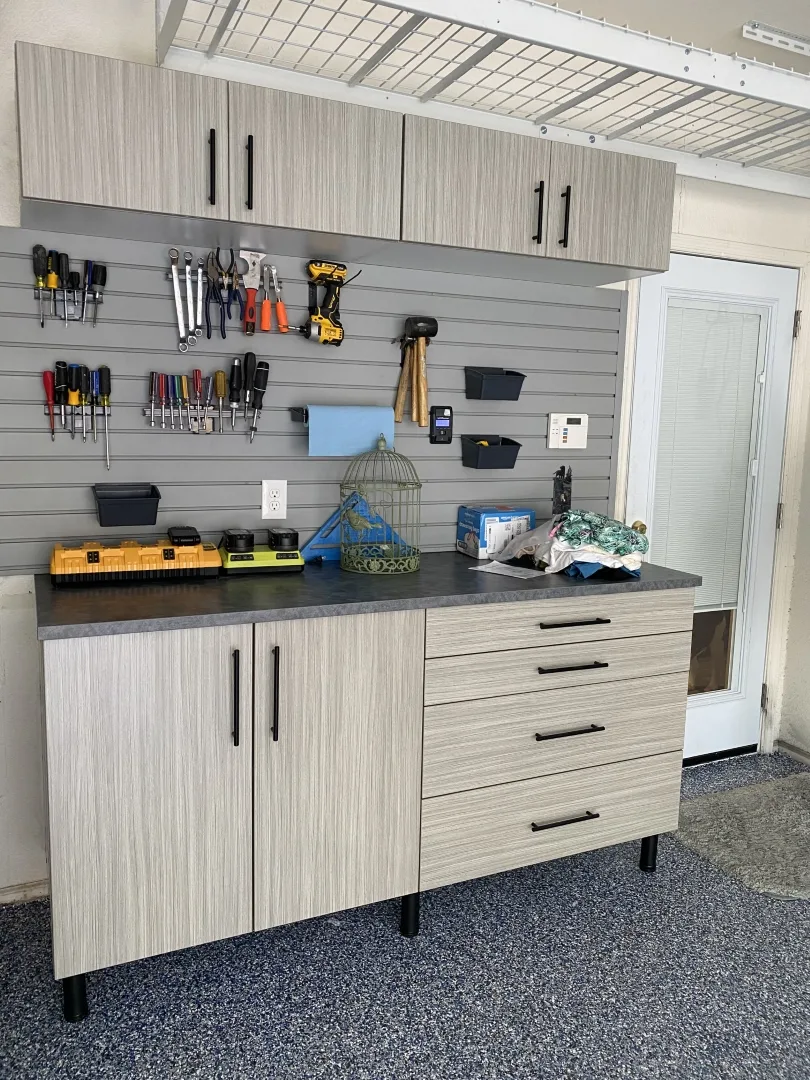 We’re proud to offer premium garage cabinets in Gilbert, AZ. A few weeks later, we came back for the third time to install some upper cabinets and a built-in workbench, along with a slatwall backsplash where he could hang a few tools. With these improvements, it will be much easier for Paul and his family to stay organized and avoid clutter.