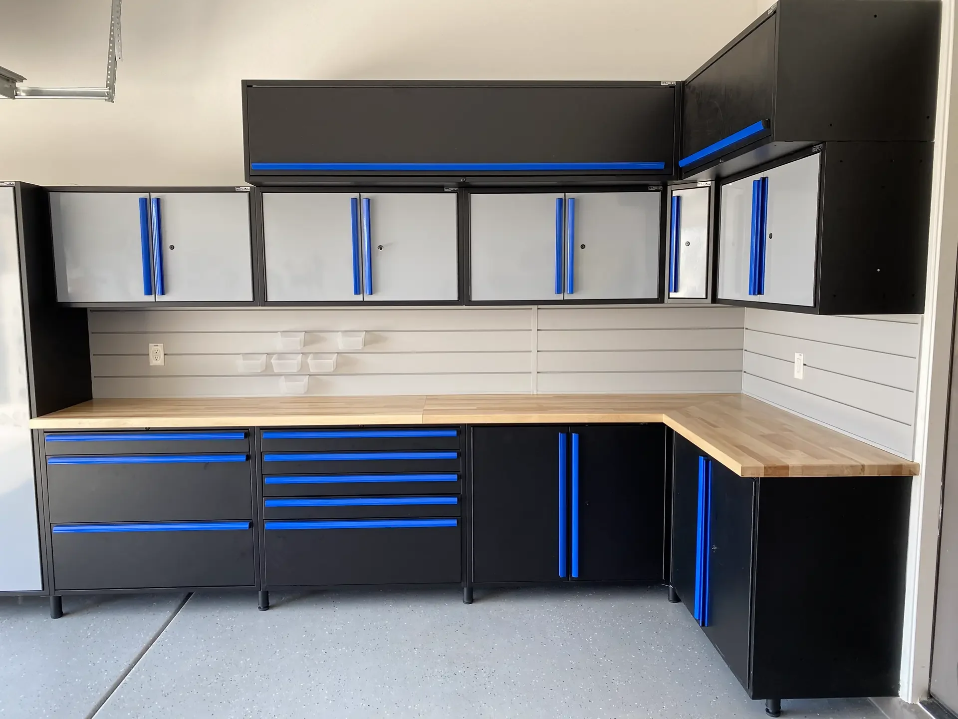 Some garage upgrades are purely functional. Others make a statement. This Queen Creek install did both—with a sleek set of black Metal Fusion Plus cabinets, accented by striking blue handles and Traffic Grey doors then topped with a solid 1.75 inch thick U.S.-grown maple butcher block that brings warmth and craftsmanship to the space.