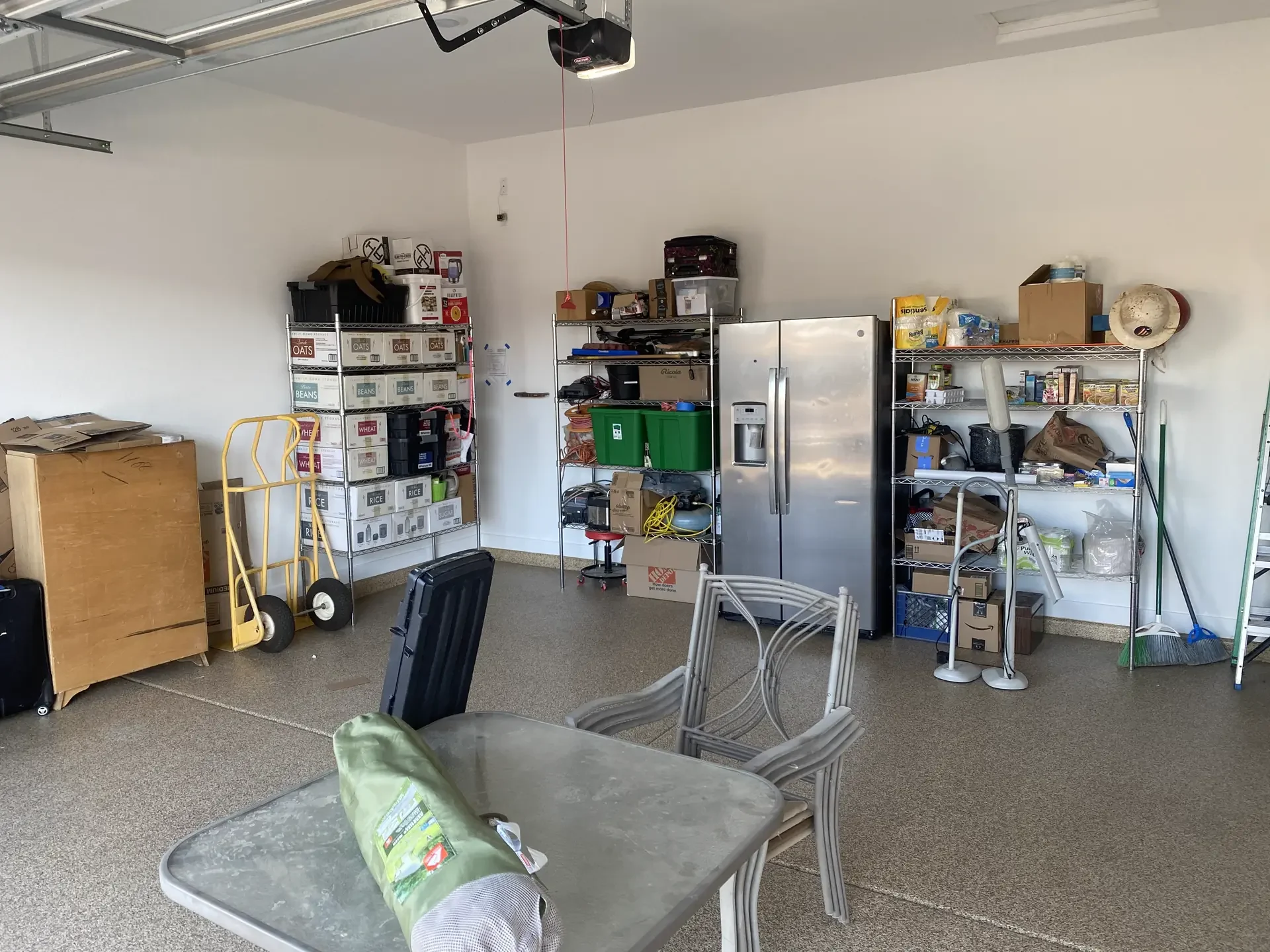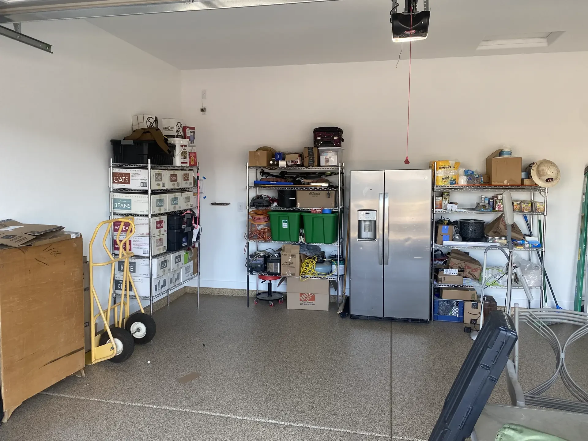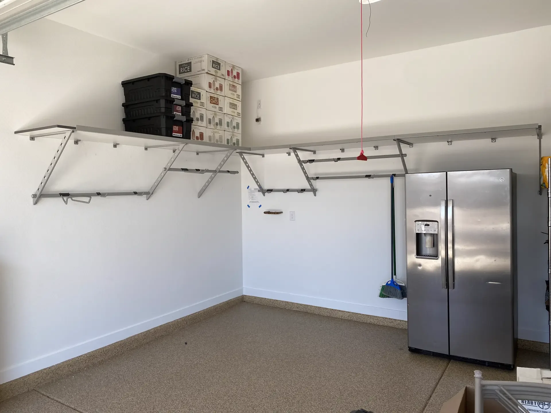 We designed a clean, efficient L-shaped Monkey Bar system that wraps the left and back walls of the garage. The shelves were custom-set to fit five stacked food storage boxes, while still leaving plenty of clearance for walking space, vehicles, and—most impressively—his refrigerator, which tucked perfectly between two brackets like it was meant to be there.