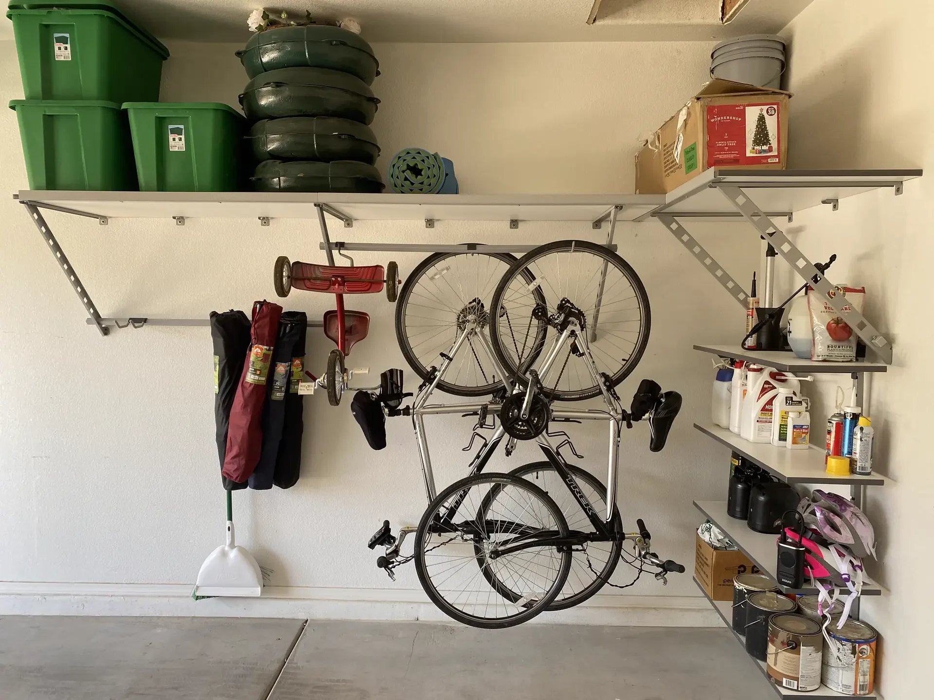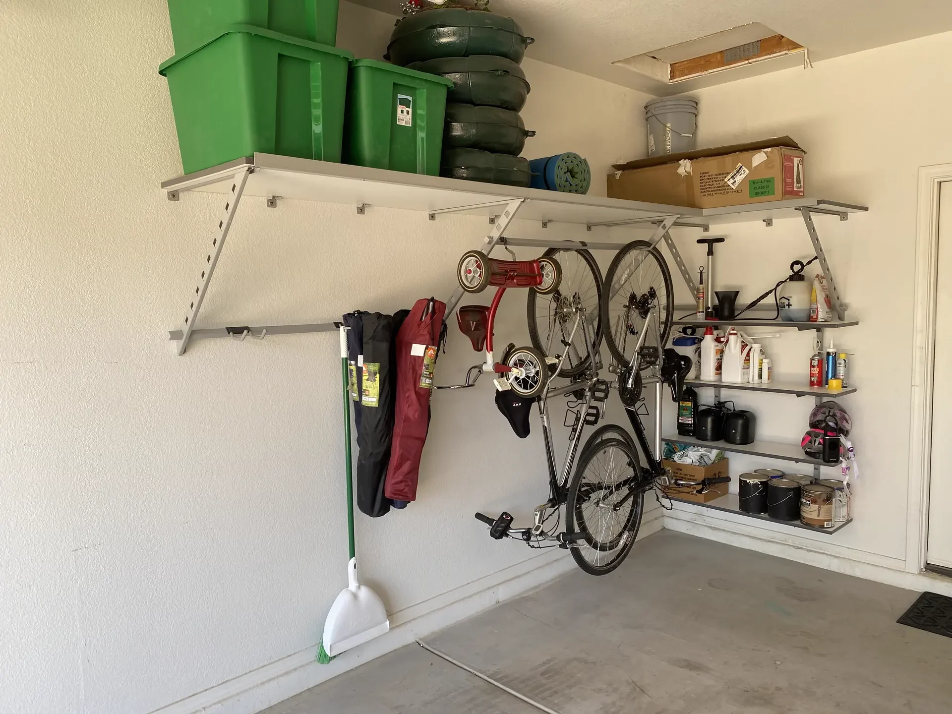 We started with our Monkey Bars shelf system, the backbone of vertical garage storage. These powder-coated steel shelves are built to handle serious weight and come equipped with a hanging bar underneath—perfect for layering storage and keeping the floor clear.